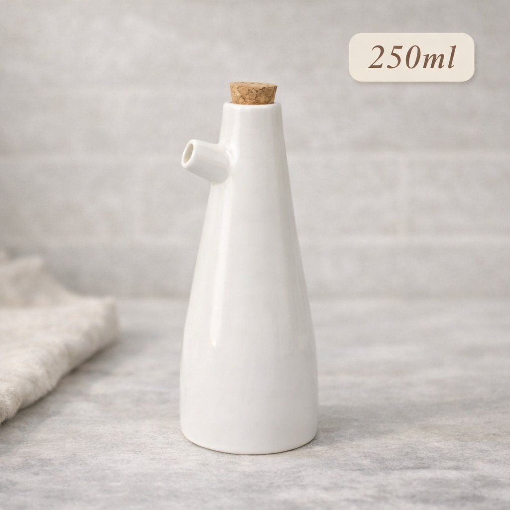 This ceramic pour bottle set combines sculptural simplicity with everyday function. Crafted in smooth white ceramic and finished with natural cork stoppers, each bottle features a slim spout designed for controlled, precise pouring.